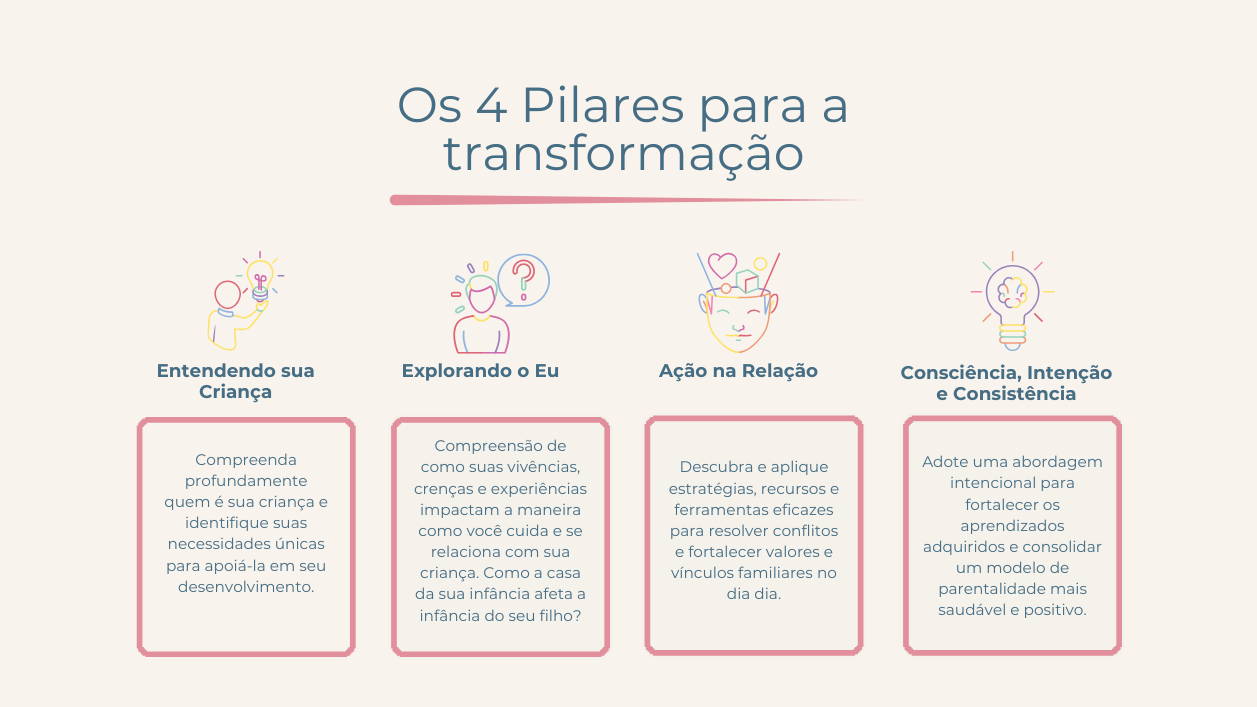 O laboratório de pais é um espaço pensado para ajudar você a transformar a maneira de pensar sua parentalidade. Cuidar da infância de forma positiva e protetiva exige uma transformação no conhecimento, na consciência e no olhar — tanto para si mesmo quanto para a criança.